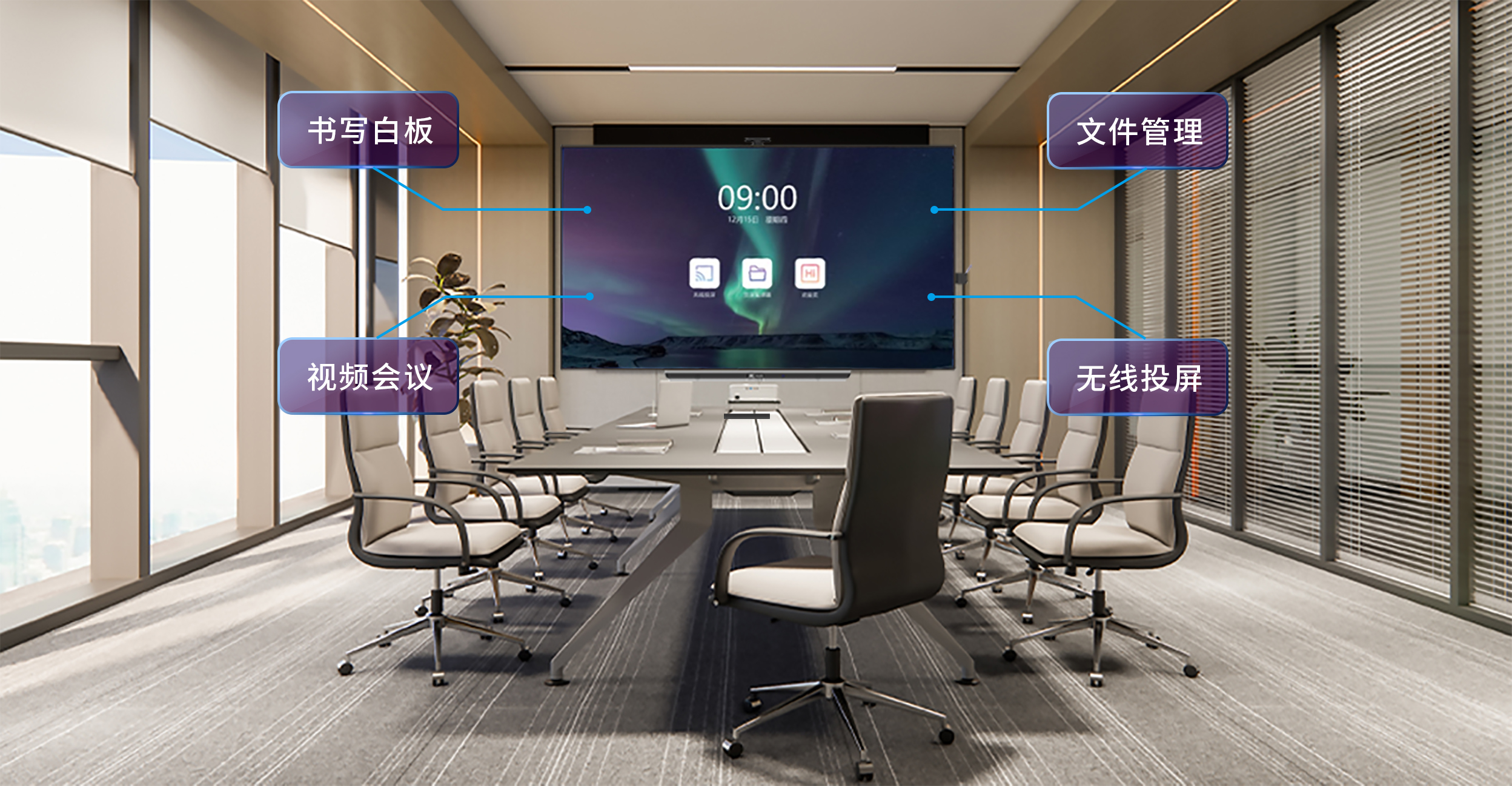 集成书写白板、视频会议、文件管理、无线投屏等多种功能,助力用户快速入会,提高工作效率,可广泛应用于政府、企业、学校等各种中大型会议室、教室、展厅等场景。